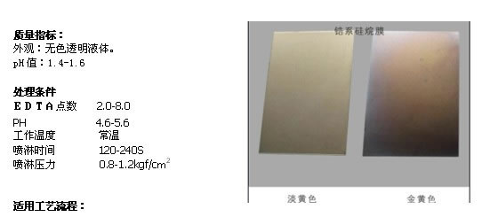 硅烷陶化處理劑是采用硅烷陶化技術開發(fā)出的一種適合噴淋法等處理方法的無磷皮膜金屬處理劑,能在金屬表面形成金黃色*深紫色的金屬氧化物以及硅烷的復合保護膜。該產(chǎn)品形成的皮膜具有優(yōu)良的耐腐蝕性,能提高涂料的附著力,是**的涂裝前處理劑。本藥劑不含磷酸鹽,無鋅,無渣,常溫*作,節(jié)能環(huán)保。一般適合自動清洗線與電泳前處理。