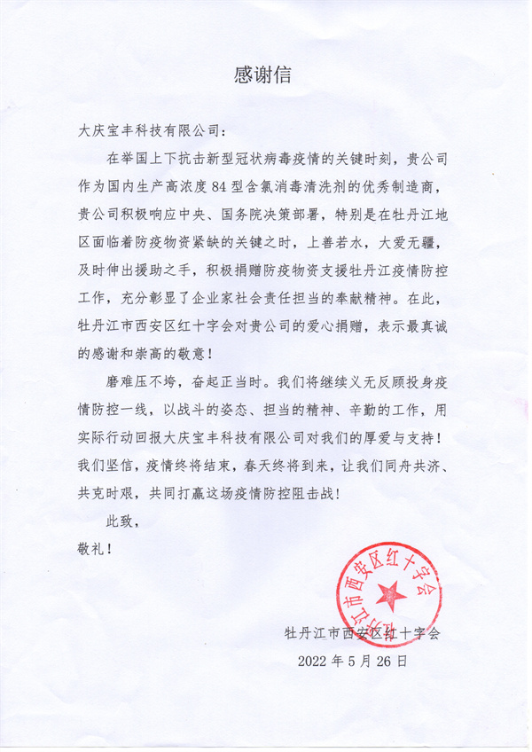 疫情無情,人間有愛。在牡丹江疫情防控的關鍵時刻,大慶寶豐科技有限公司積極響應號召,迅速行動,向牡丹江紅十字會捐贈了一批急需的**劑,為抗擊疫情貢獻出自己的力量。